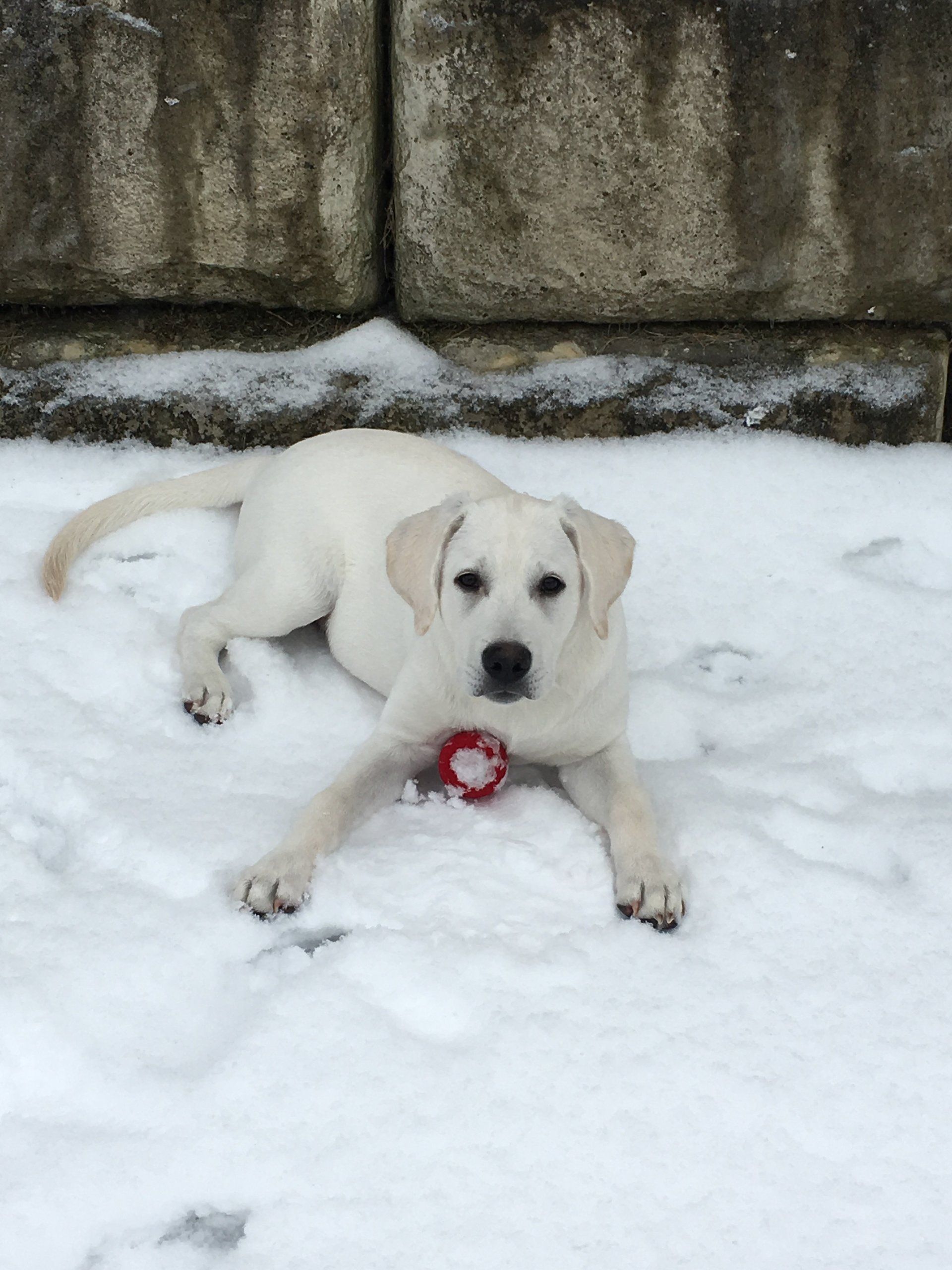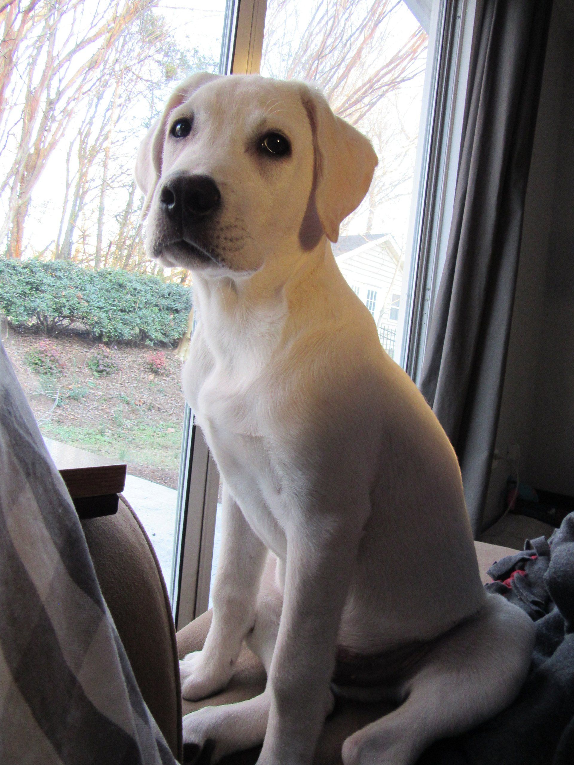 She is just the best dog and getting smarter and prettier every day. People comment on how shiny and beautiful her black coat is and it just shines in the sun! She's really athletic and loves to play on our playground with the kids ( she will climb up the ramp and wait for one of us to take her down the slide on our laps! She could do this for hours! Haha) She has had lots of play time with several other lab/golden puppies in the neighborhood. We have two adult black labs that live across the street and they love her. She has mastered commands quickly and uses the potty bell like a champ. I can't believe how fast she corrects herself when she knows she has done something she's not supposed to do. She's a cuddler but also really likes her alone time in her crate with her favorite snuggle toy. (I think this is just the sweetest and smartest thing of all..that she knows where her special personal place is) Vet visits are going well and she's growing fast.